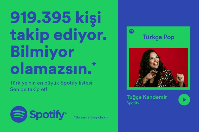 Türkçe pop müzik, Spotify kullanıcıları tarafından Türkiye’de en çok dinlenen müzik türü. Öyle ki bir milyona yakın takipçi sayısı ile Türkçe Pop, Türkiye’nin en büyük Spotify çalma listesi olarak ilk sırada. Hatta Spotify’da ilk kez müzik dinleyenlerin ilk tercih ettikleri çalma listesi de Türkçe Pop. İşte Spotify, ünlü pop sanatçılarıyla bir araya gelerek, Türkiye’nin en büyük çalma listesi Türkçe Pop’un gücünü “bu kadar kişi yanılıyor olamaz” mottosuyla hem dijital platformlara hem de outdoor’a taşıdı. Kampanyada, Zeynep Bastık, Irmak Arıcı, Hande Ünsal, Ziynet Sali, Buray, Edis, Tuğçe Kandemir, Ece Seçkin, Bilal Sonses, Oğuzhan Koç gibi ünlü isimler, Türkçe Pop listesinin takipçi sayısına atıfta bulunarak, “919,395 kişi yanılıyor olamaz”⭑ dedi.